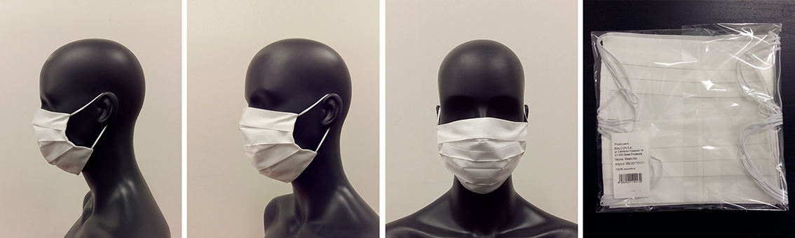 Maseczki jednowarstwowe z tkaniny 100 % bawełna medyczna z certyfikatem Oeco-Tex, gramatura 180 g/m2